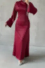 Dökümlü Kol Işıltılı İşlemeli Saten Tesettür Abiye Bordo