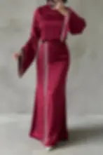 Belden Bağlamalı Balon Kol Saten Tesettür Abiye Mürdüm