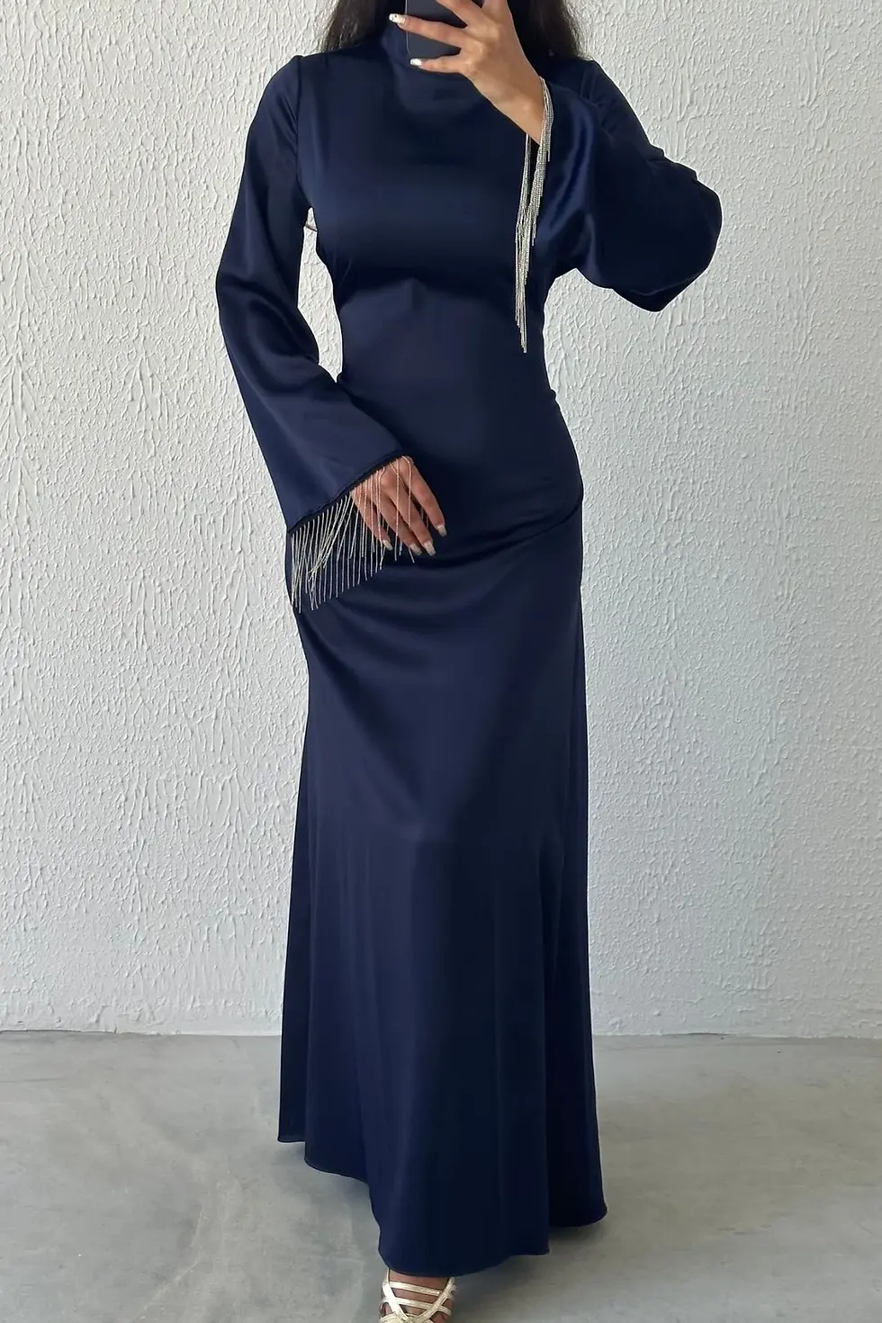 Şerit Taş İşlemeli Saten Tesettür Abiye Lacivert